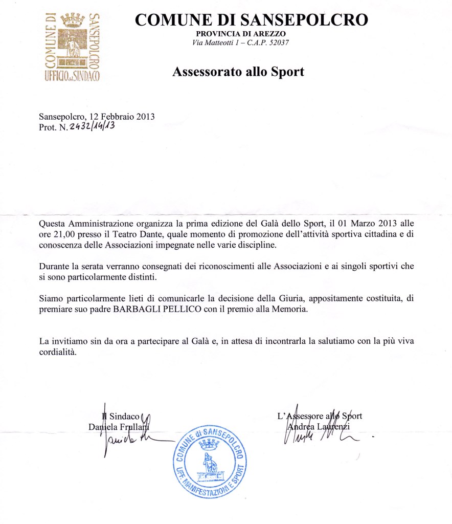 Cerimonia di intitolazione del piazzale antistante al palazzetto dello sport, al professor Pellico Barbagli alla presenza del sindaco della Città, dei figli, nipoti e bisnipoti del Professore, giornalisti e targa commemorativa. Da oggi la Città di Sansepolcro ha un nuovo indirizzo civico a cui riferirsi.